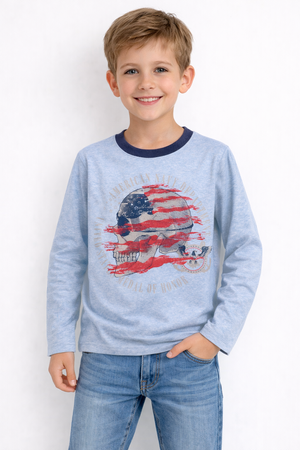 Bluzka chłopięca z długim rękawem w kolorze niebieskim. Wykonana z bardzo przyjemnej w dotyku, wysokiej jakości dzianiny. Podkrój szyi wykończony elastycznym, granatowym ściągaczem. Oryginalny nadruk tworzy niepowtarzalny charakter koszulki.