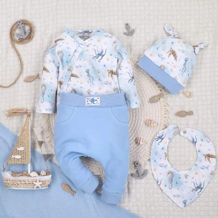 Komplet niemowlęcy z kolekcji SEA OF JOY składający się z body, spodni ,czapeczki i apaszki.